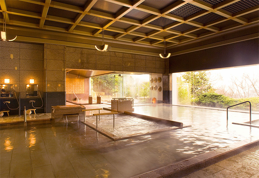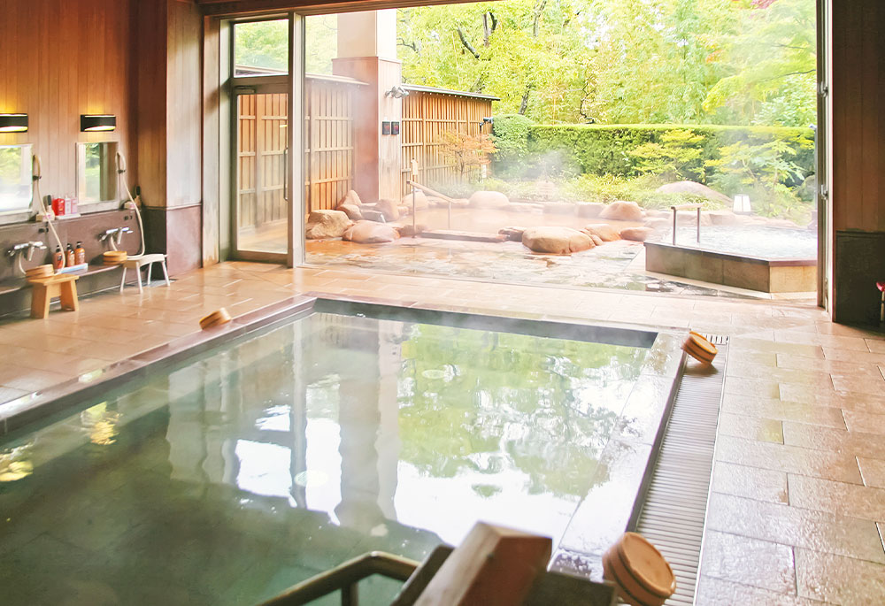 9階庭園に位置する「三の湯」は、昔懐かしい湯治場の雰囲気を持つ大浴場です。内湯と露天風呂の間にある開閉式のガラス戸を開け放つと、浴室全体が開放感あふれる半露天風呂に早変わり。四季折々の自然を感じながら、体も心も解放されるバスタイムをお過ごしいただけます。