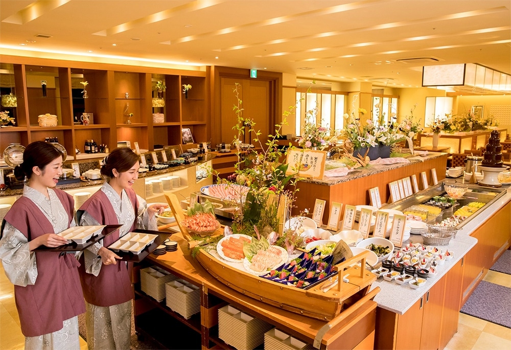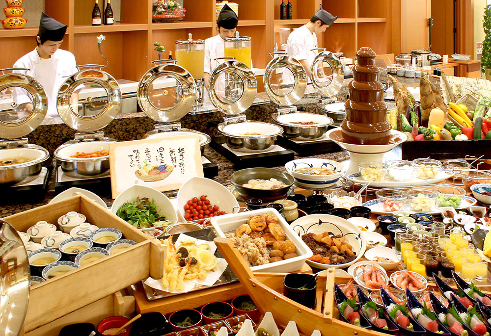 お客様の好みやシーンに合わせて、様々なスタイルで料理を楽しんでいただけます。季節の旬会席をお部屋でゆっくりと堪能する「お部屋食」、レストランでの食事、炭火焼会席、そして約50種類のお料理が並ぶ「有馬四季菜ブッフェ」など、多彩な選択肢をご用意しています。