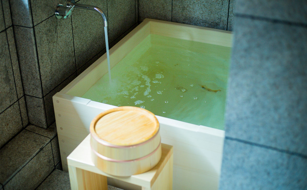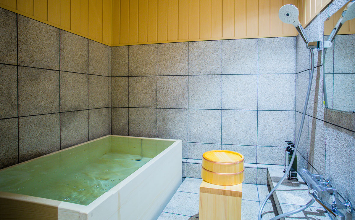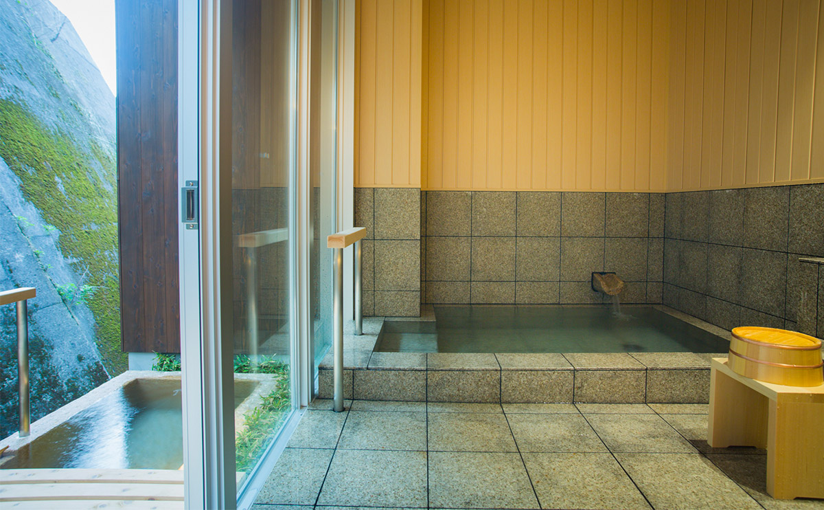 客室の木の浴槽とは一味違って半露天の岩風呂と内湯を備えた貸し切り温泉で、日頃の疲れを洗い流すひとときをお過ごしいただけます。この温泉は、さらさらと流れ落ちる湯の音に耳を傾け、風が頬を撫でる心地よさを感じながら、究極のリラクゼーションを追求するための空間です。