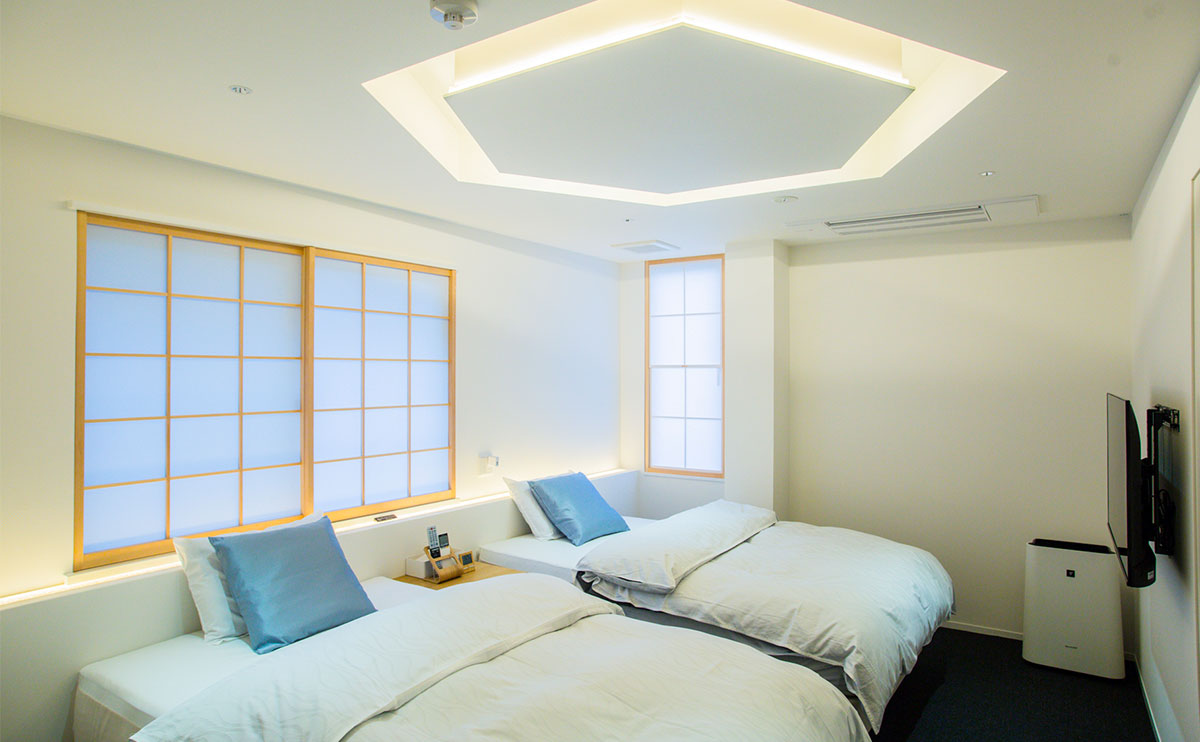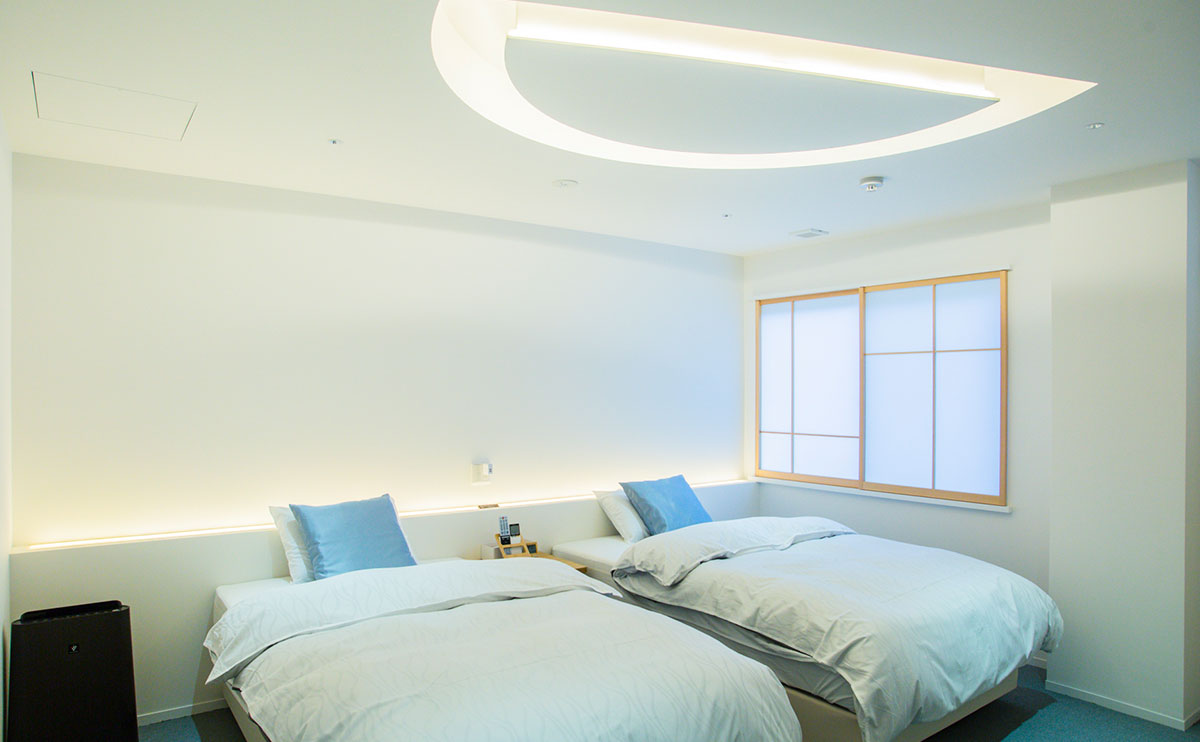 「月」の客室は、満ち欠けを繰り返す月の神秘的な美しさに包まれています。弦月(げんげつ/ゆみはり)のように輝く月をイメージしたデザインが、室内に繊細な影を落とします。山側に位置するこの部屋では、夕刻になると木洩れ陽が室内に濃淡の影を作り出し、半分だけ浮かび上がる月の姿を眺めながら、見えない美しさを想います。