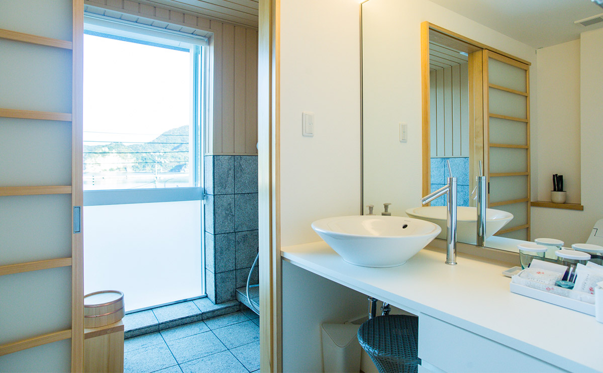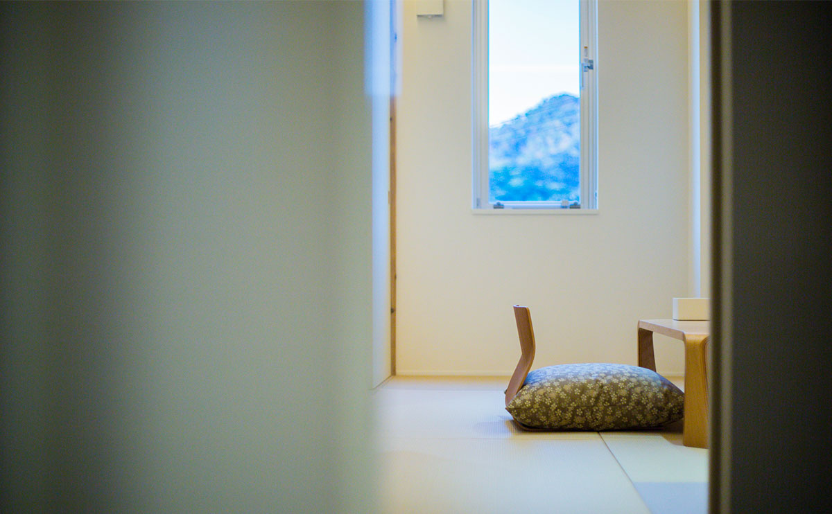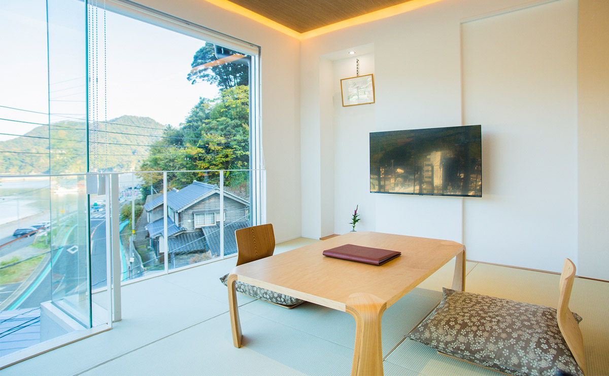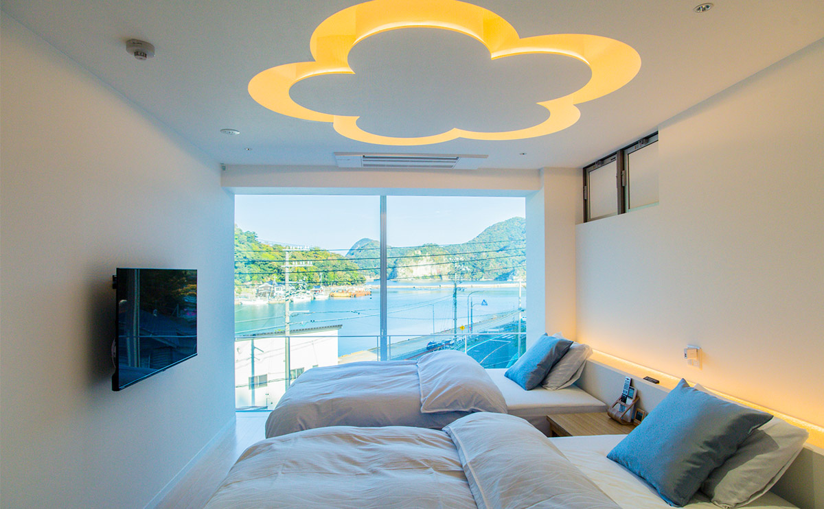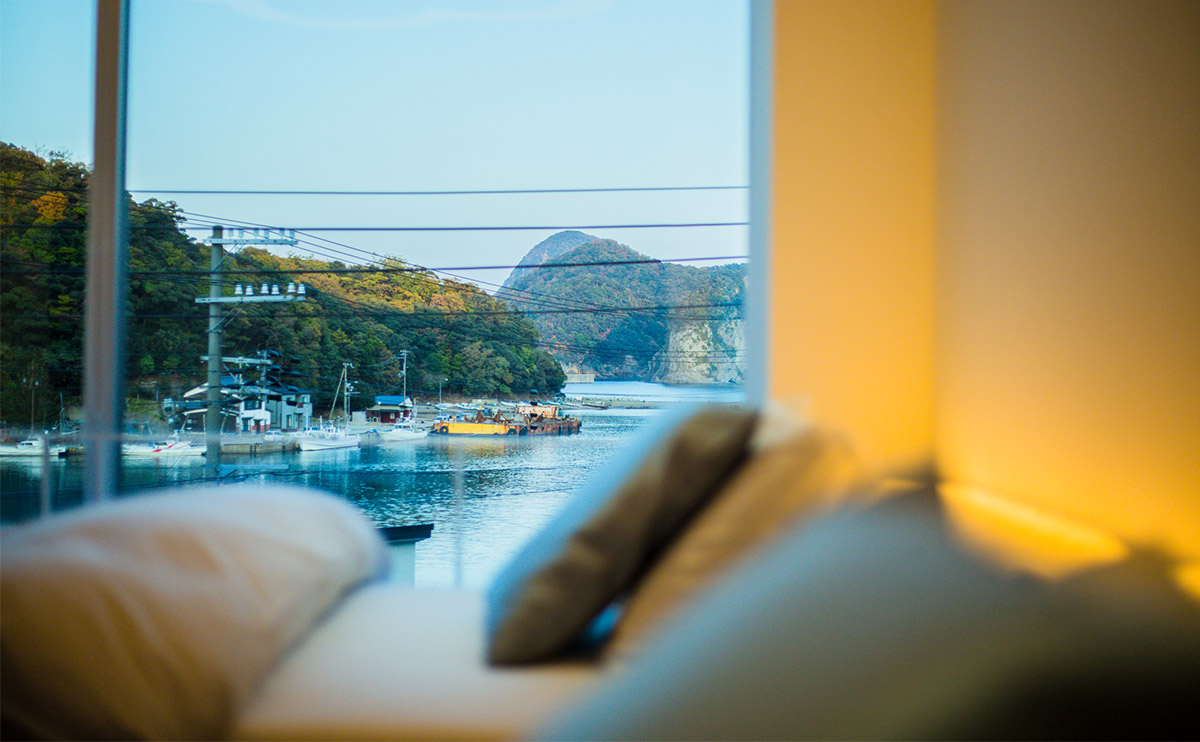 「花」の客室からは、港町特有の景色を一望できます。和室、寝室、浴室どこにいても、海を身近に感じることができます。近くには舟屋の面影を残す光景、遠くには臼が浦島の稜線が広がり、赤灯台や釣り人を乗せた白い船がのんびりと海を横切る様子を楽しむことができます。日が傾くと、海の色は明るい水色から深い緑色へと変わり、寝室の天井には静かにほころぶ五弁の白梅が夜の始まりを告げます。