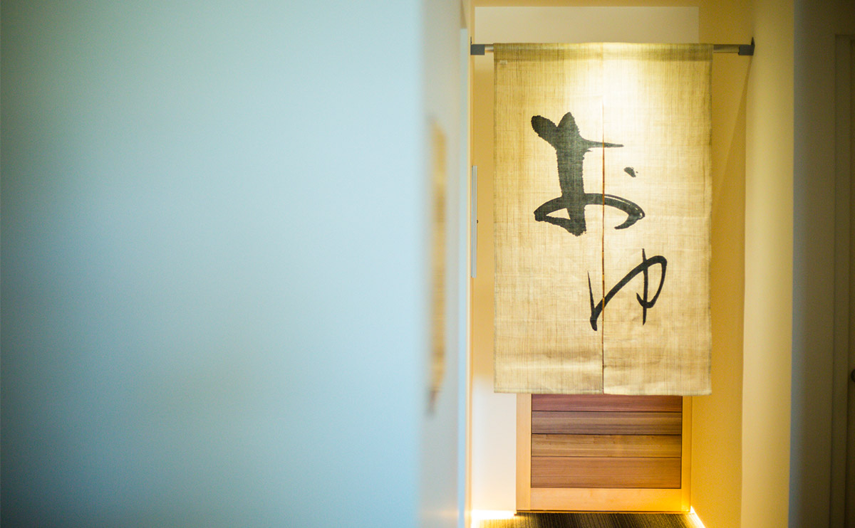 やわらかな筆致で描かれた暖簾が、さりげなく温泉へと誘います。温泉で湯に浸かり、自然の風を感じながら、日常とは異なるゆったりとした時間をお過ごしいただけるでしょう。夕庵は、訪れるすべてのお客様にとって、特別な場所となることを約束します。お越しを心よりお待ちしております。
