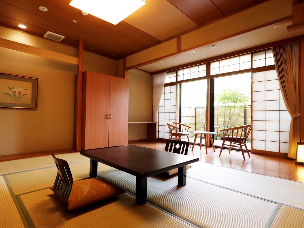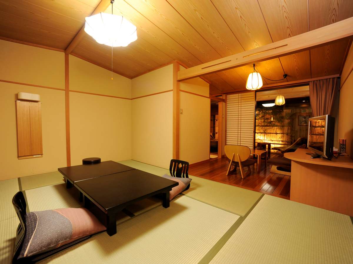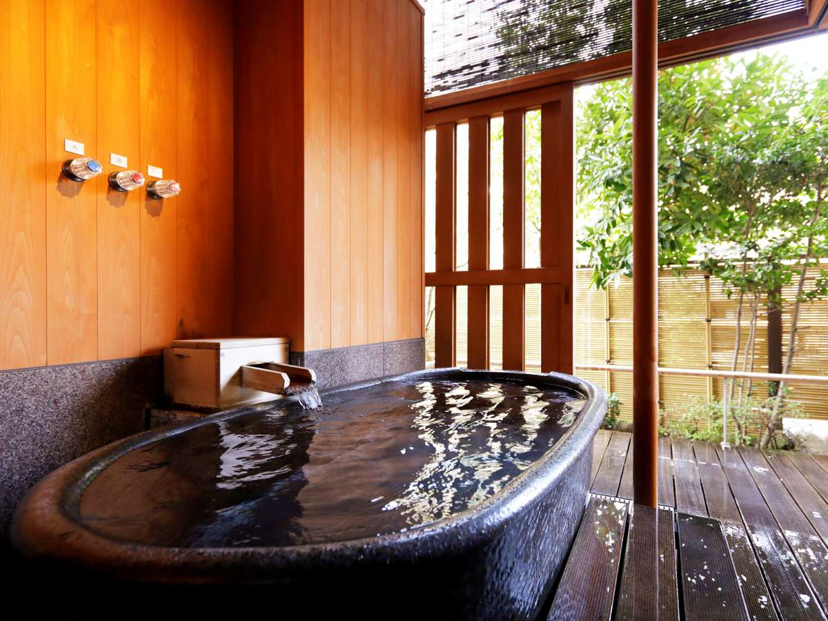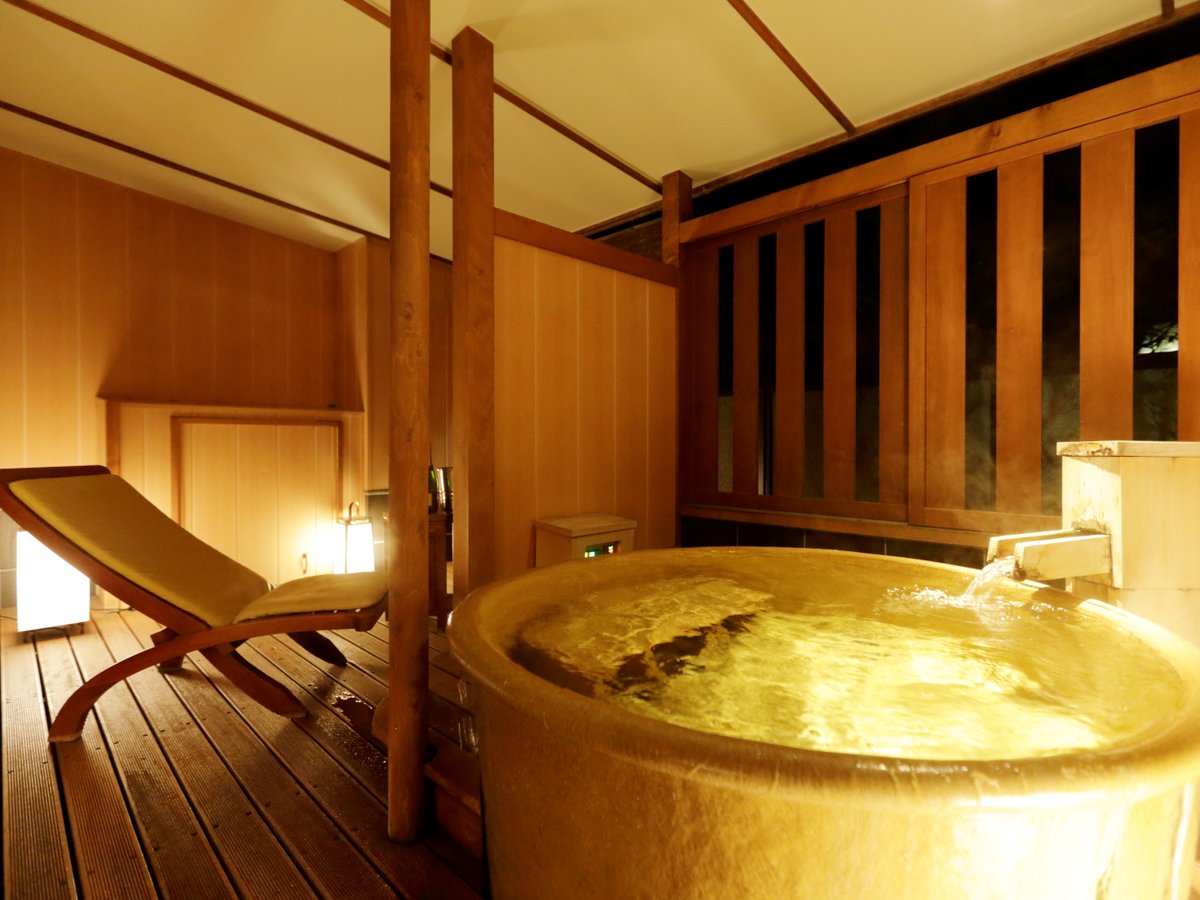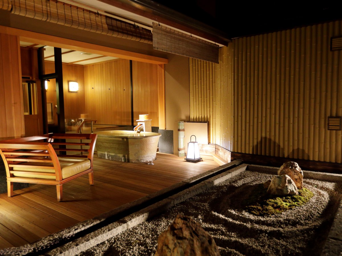 「風の庵」は、客室露天風呂でお客様だけの特別な空間をお愉しみいただける、和モダンを基調とした客室です。庵をイメージした静謐なプライベート空間で、ラジウムゲルマニウム浴槽または木製浴槽に身を沈めながら、身体の芯から温まり、日々の疲れを癒してください。