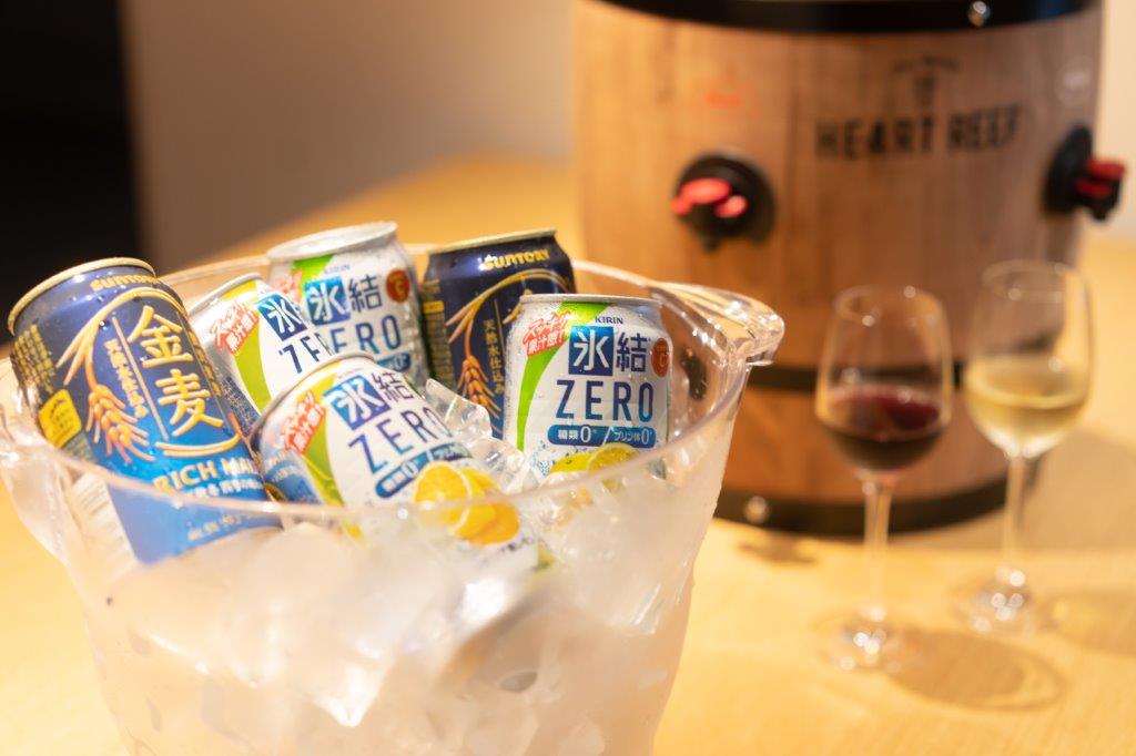 特に嬉しいのは、17時からはアルコールドリンクもフリーでご用意していることです。赤ワイン、白ワイン、発泡酒、缶酎ハイなど、バラエティ豊かなラインナップをご用意しております。一日の疲れを癒やすドリンクを、リラックスした雰囲気の中でお楽しみください。