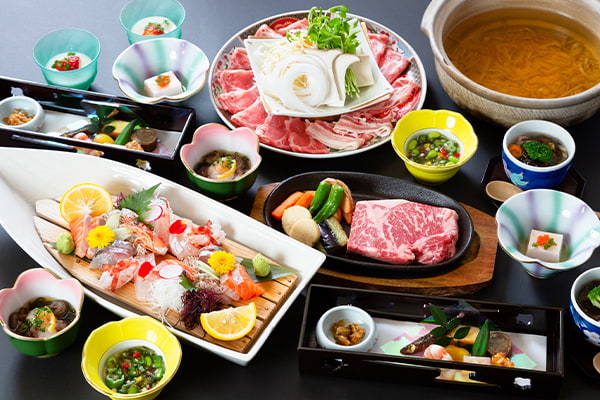 豊山荘では、地元大分県豊後の食材を活かした会席料理が自慢です。四季折々の旬の味を堪能できる「ぶんご旬会席料理プラン」は、食前酒から始まり、新鮮なお造り、季節のお鍋、そして甘味に至るまで、食の全てが一つの物語のように展開します。できるだけ地元の野菜を使い、温泉を活用した料理の数々は温泉の街-別府らしさに溢れています。事前予約で、バースデーケーキや和牛ステーキのご注文も可能です。