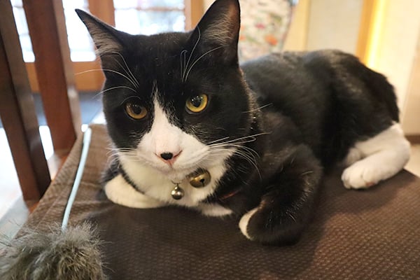 そして、「天」という名前の猫は、地元産のニャンコです。彼は、おっとりとした性格で、お尻をトントンされるのをとても気に入っています。鼻の中央にある「点」からその名が付けられました。某新聞社の猫カレンダーで2年連続2月のモデルを務めるなど、彼もまた豊山荘のスター猫です。