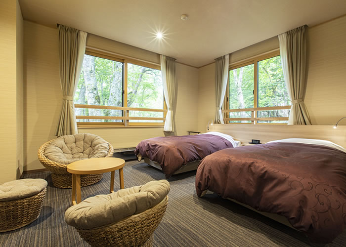 木の温もりを感じる伝統的な日本の美しさと現代の快適さが融合しています。自然の木材を使用した内装は、穏やかで心地よい雰囲気を醸し出し、畳の上に広がる柔らかな布団で心温まる眠りにつくことができます。窓越しには、木々に彩られた美しい景色が広がり、日本の四季を感じることができます。